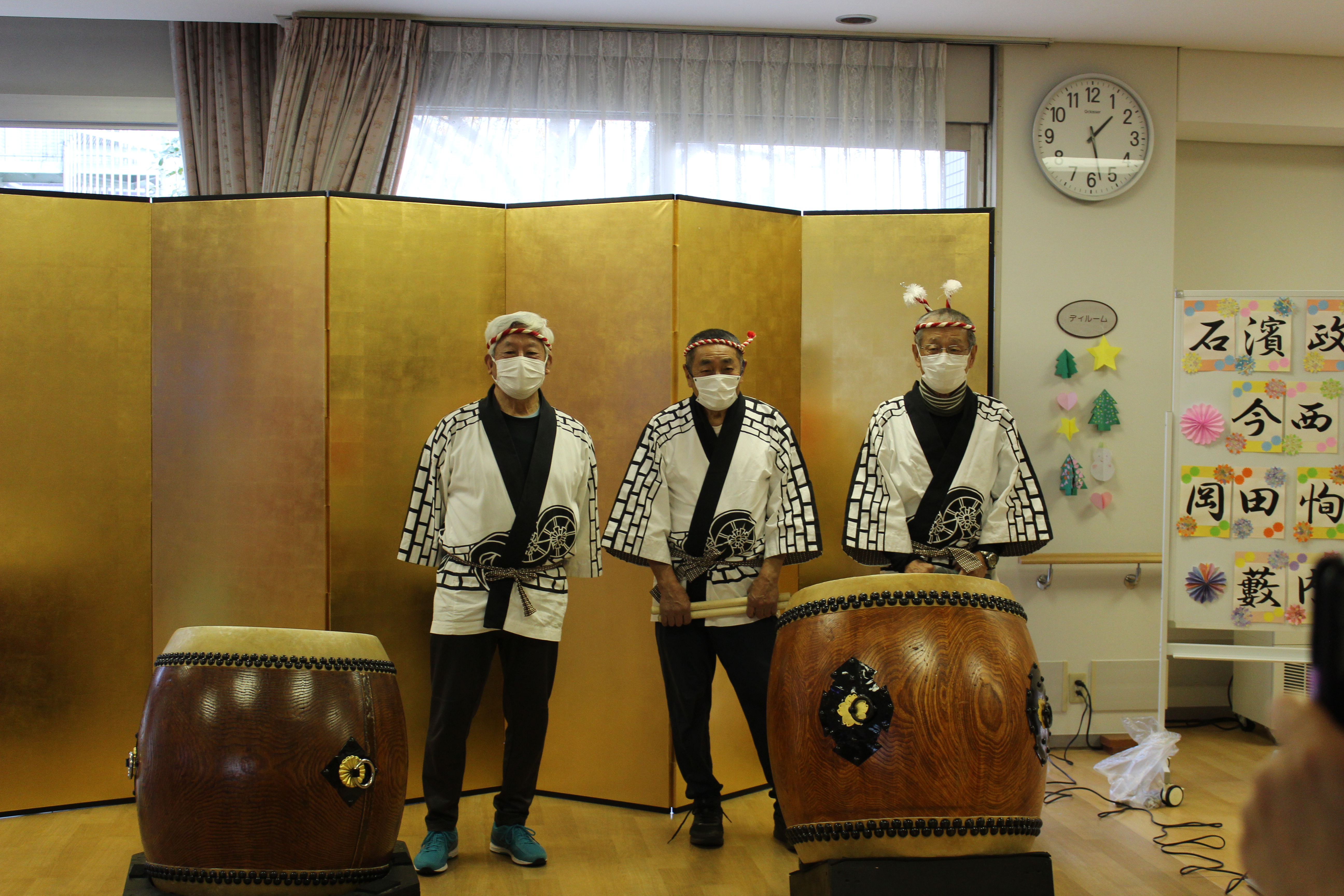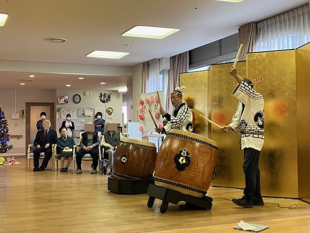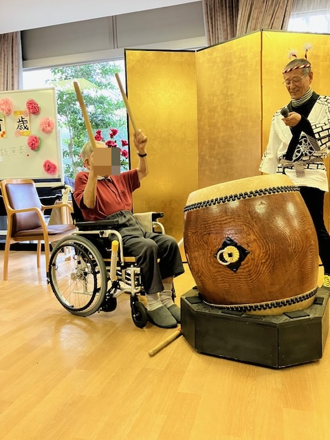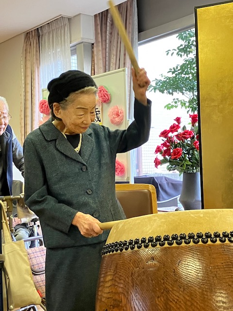 演奏の後、「太鼓を叩いてみませんか?」とお誘いくださったので、来月百歳を迎えられるI様がドドン! しっかり響く大きな音を鳴らされます。